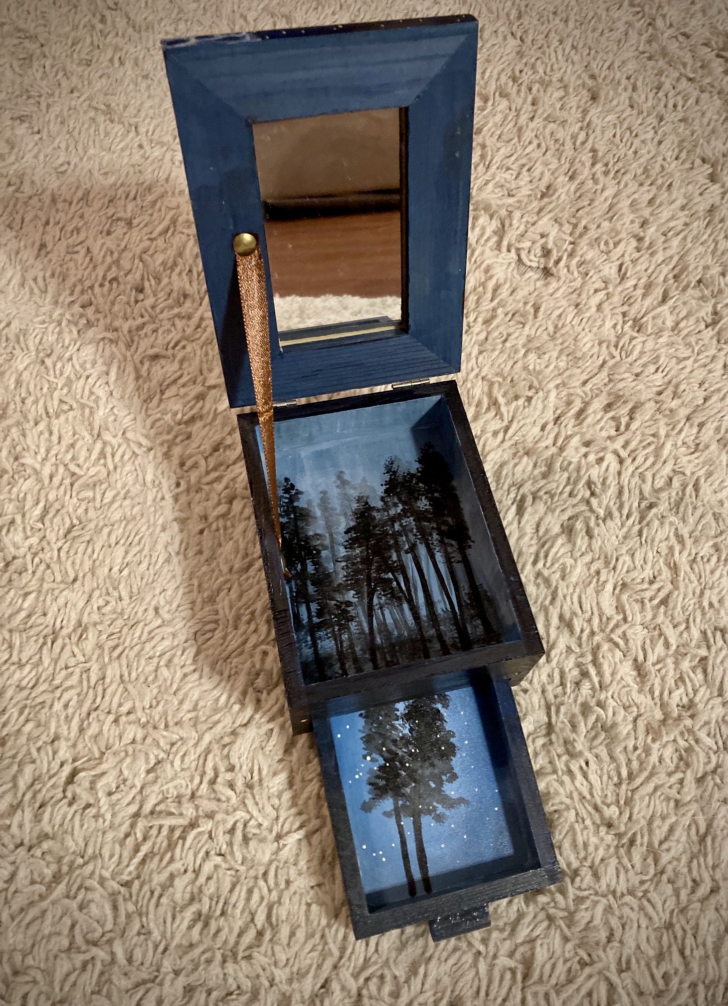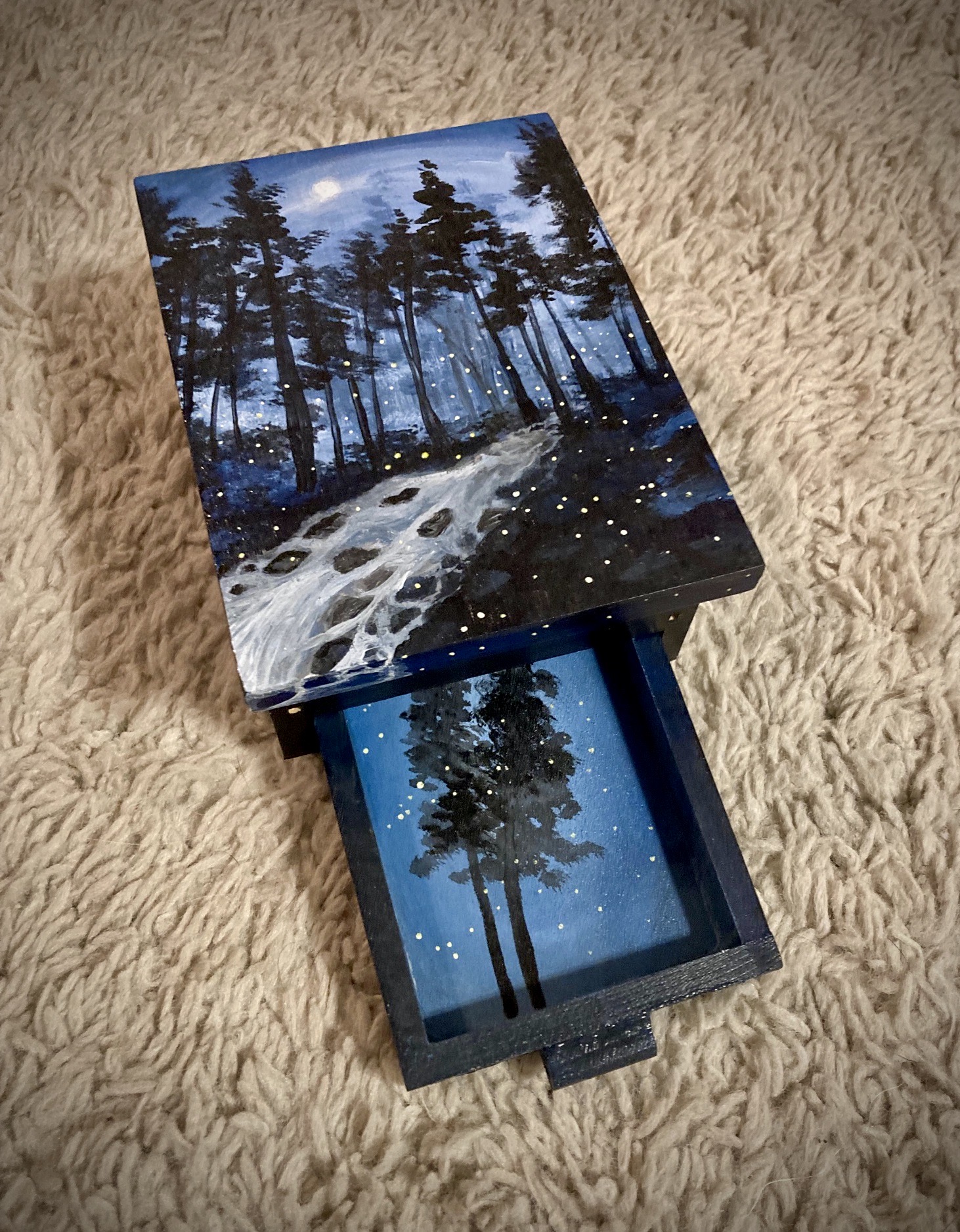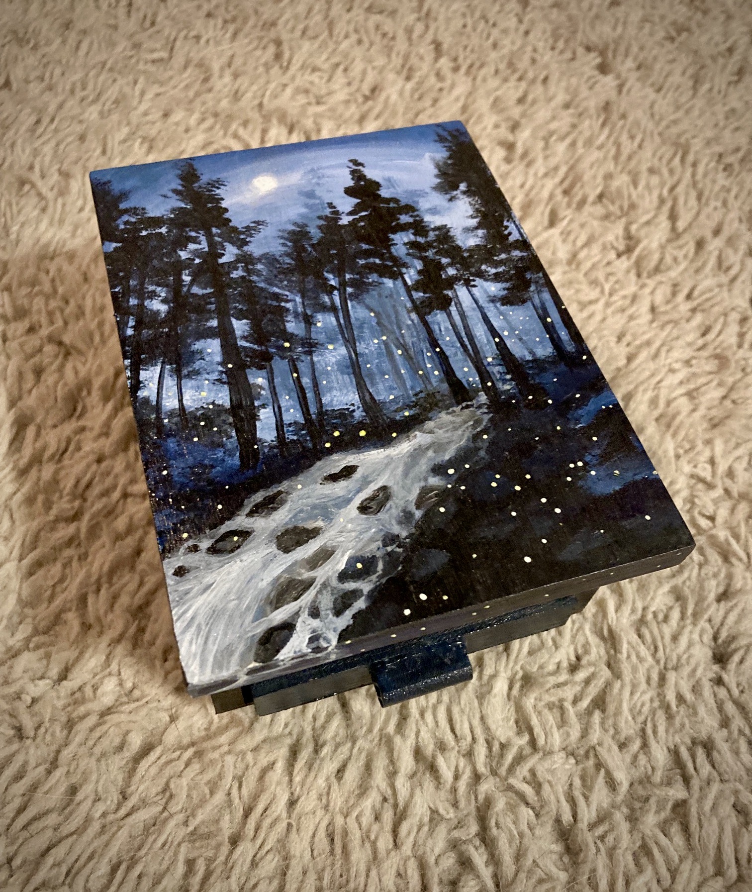 This box was inspired by a Smoky Mountain backpacking trip with my sister. Every year in early June there is a species of firefly that gathers in only two places in the U.S. – Elkmont, Smoky Mt National Park in Tennesse and Congaree National Park in South Carolina. There is a lottery system to see this event, but only at the front country campsites. I knew nothing of this event or that it even existed when I selected the backcountry campsites for our trip that year. Earlier that day I got a text from the national park service about parking closures for the synchronous firefly event. I payed no mind because I didn’t know what it was about and we continued on our day. We entered the backcountry at around 1 pm and reached our campsite at 4. As we got in our tents after dinner that night, not another soul out there, with the sounds of the rushing river in the dark woods, slowly little fireflies began to appear one by one. My sister and I lay in our tents watching as we were preparing for sleep. More and more fireflies appeared. As I watched them I noticed they started to sync up their flashing. They would flash on and off and then go dark, at the same time. I told my sister and she didn’t believe me but then saw what I was talking about. More and more fireflies appeared. We jumped out of our tents and watched as the forest filled with thousands and thousands of twinkling lights, all appearing and going dark at the same time. It was total magic! This box attempts to embody that experience. We were blessed by God that night in a dazzling and mysterious display of His creation. Just as the still small voice speaks to our hearts, the most gentle yet brilliant beauty showed up in the quiet forest that night.